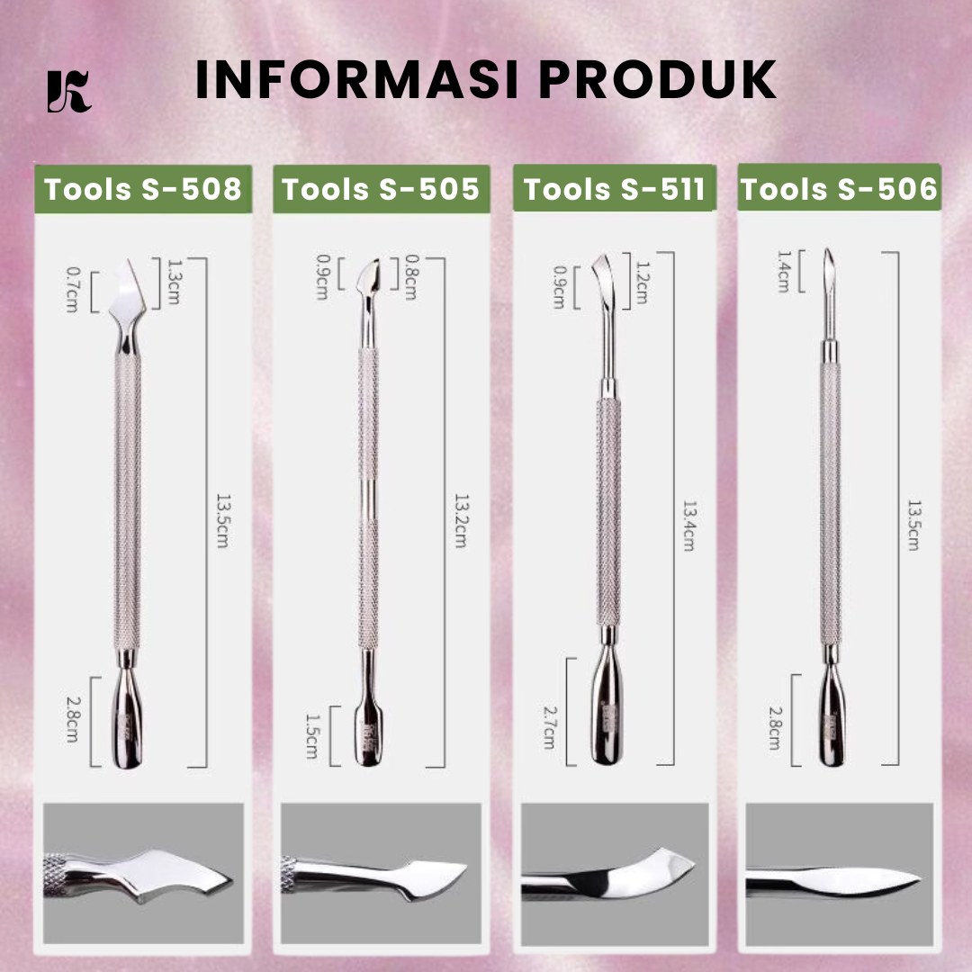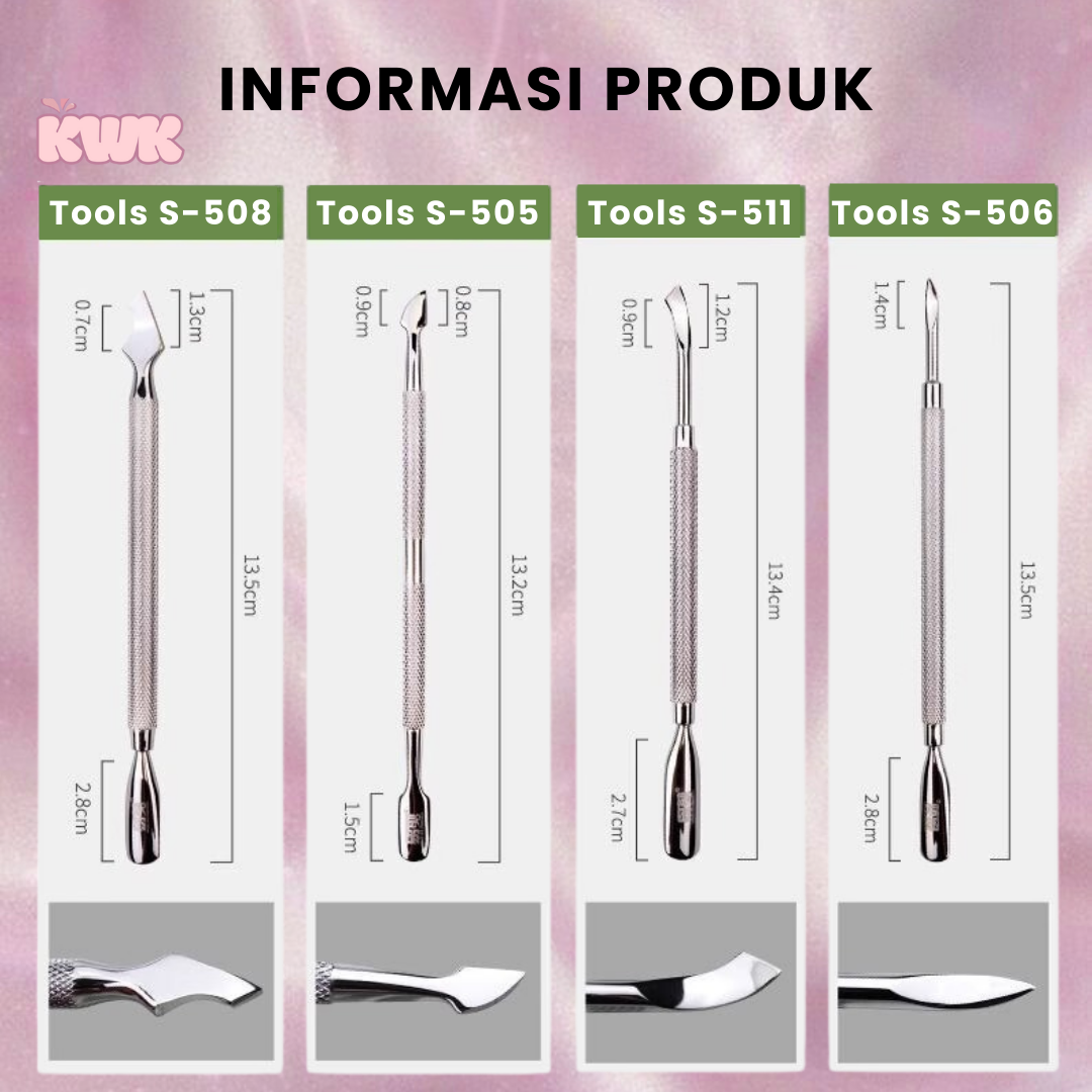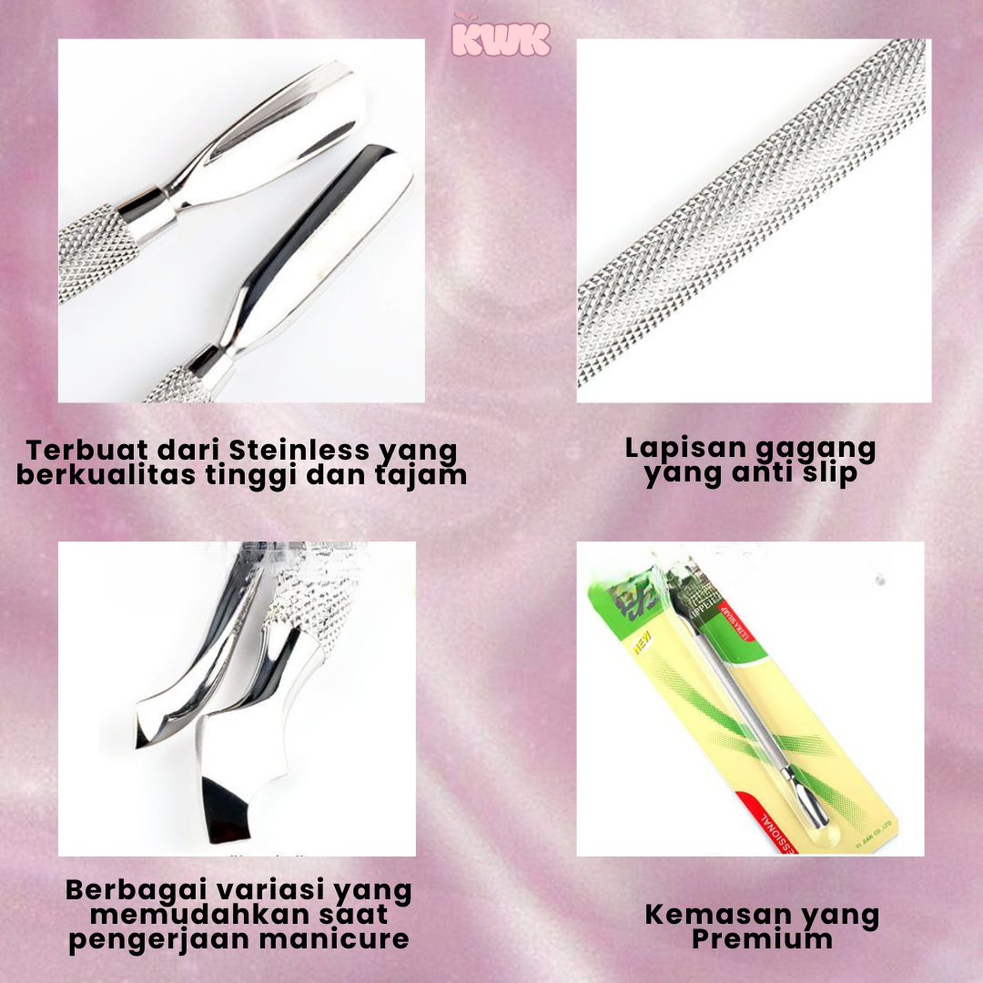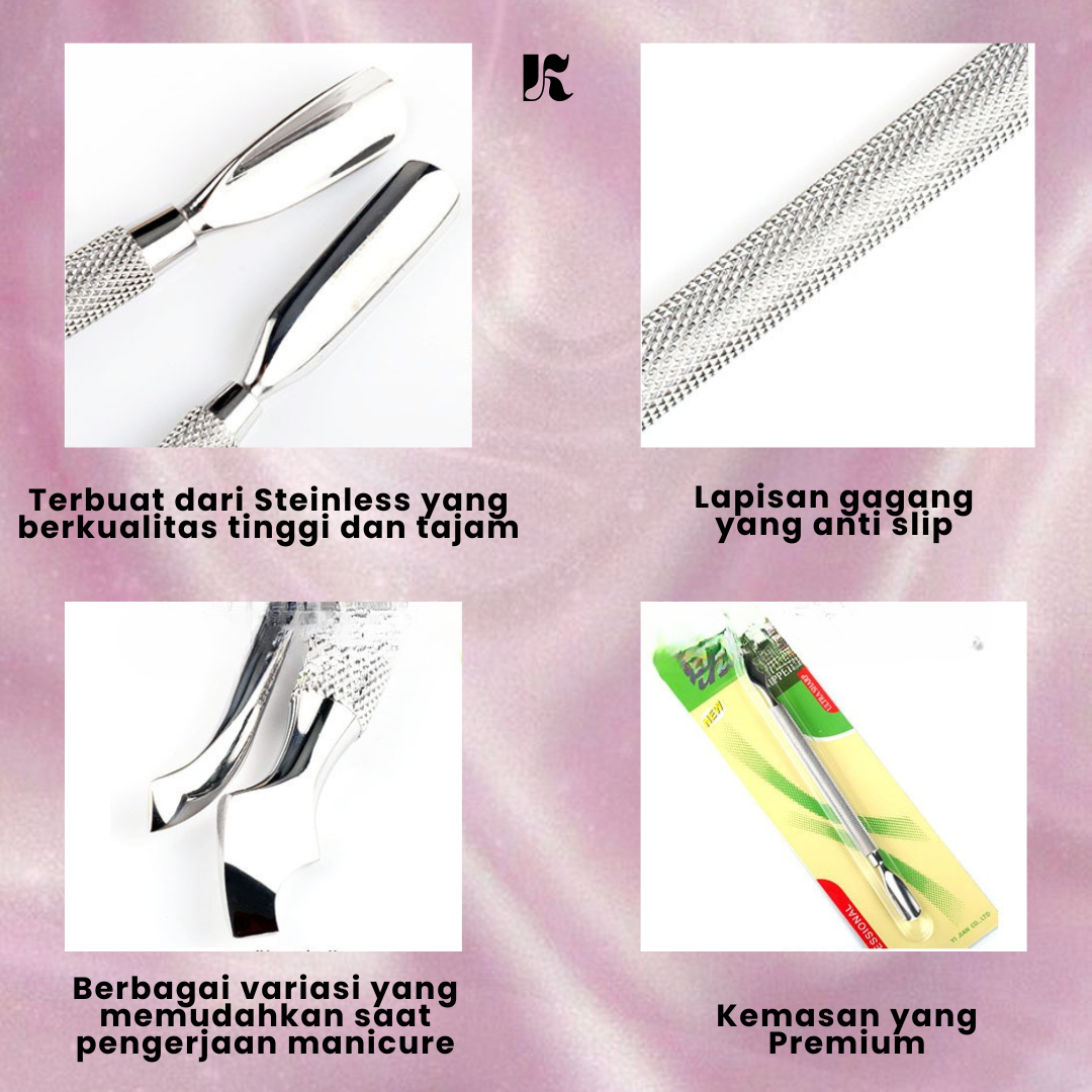 Pendorong kutikula dengan besi ujung tajam dan dapat membersihkan keseluruhan kutikula. Bahan Stainless Steel sangat bagus dan premium. Terjamin anti karat dan tidak akan menghitam