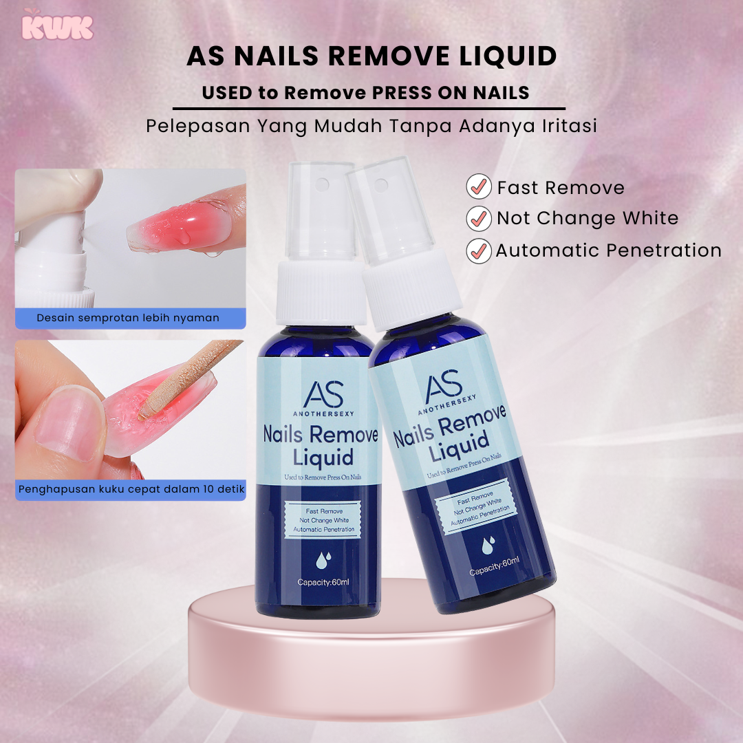 AS Nails Remover Liquid adalah cairan penghapus khusus untuk produk kuku buatan, seperti gel polish, nail extension (kuku palsu berbahan gel atau akrilik), dan lem kuku. Produk ini digunakan untuk melepas atau melarutkan bahan kuku tiruan dari kuku alami tanpa merusaknya