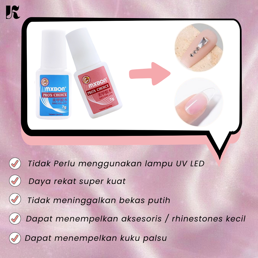 Lem untuk merekatkan kuku palsu ke kuku asli. Mengeringkannya tanpa UV LED. Bisa juga digunakan untuk lem aksesoris.