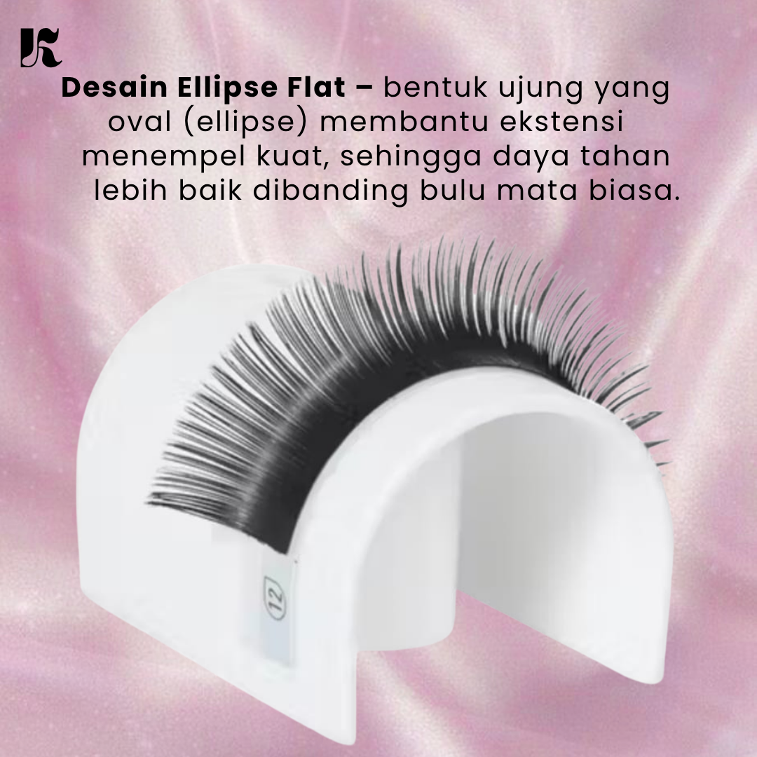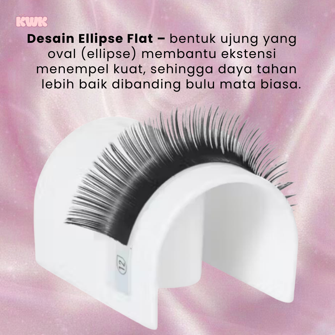 Desain Ellipse Flat – bentuk ujung yang oval (ellipse) membantu ekstensi menempel kuat, sehingga daya tahan lebih baik dibanding bulu mata biasa.
